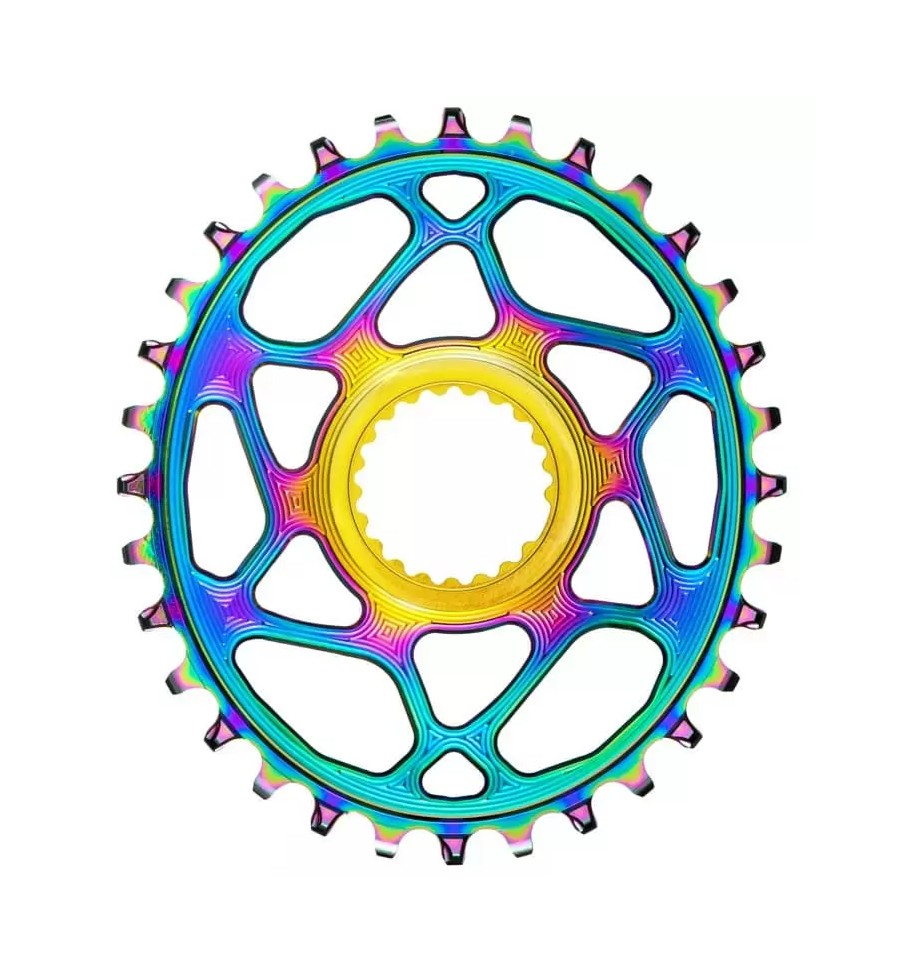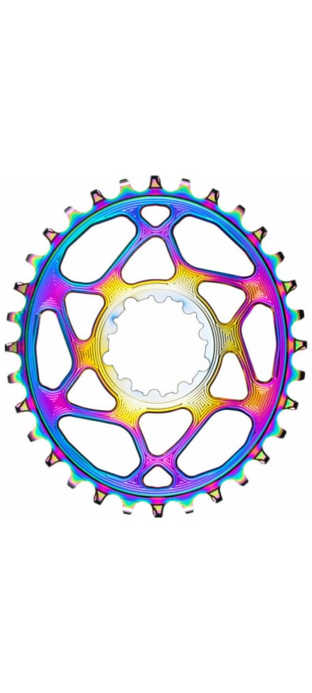 The Original one and only absoluteBLACK Premium Shimano 12spd Hyperglide+ compatible Direct mount 1X Oval chainrings in PVD Rainbow (oil slick) colour. Designed for XTR M9100, XT M8100, SLX M7100 & Deore M6100 cranks. Super smooth pedaling experience. This chainring is specifically designed to work with CN-M9100, 8100, 7100 & 6100 Shimano 12spd Hyperglide+ chain due to different thickness of the teeth. This special PVD Rainbow Titanium coating process makes the chainrings very durable and incredibly beautiful. It is the most Premium oval chainring on the market with scientifically proven performance gains.