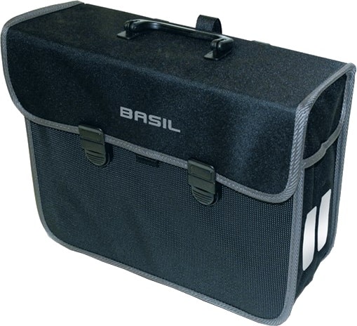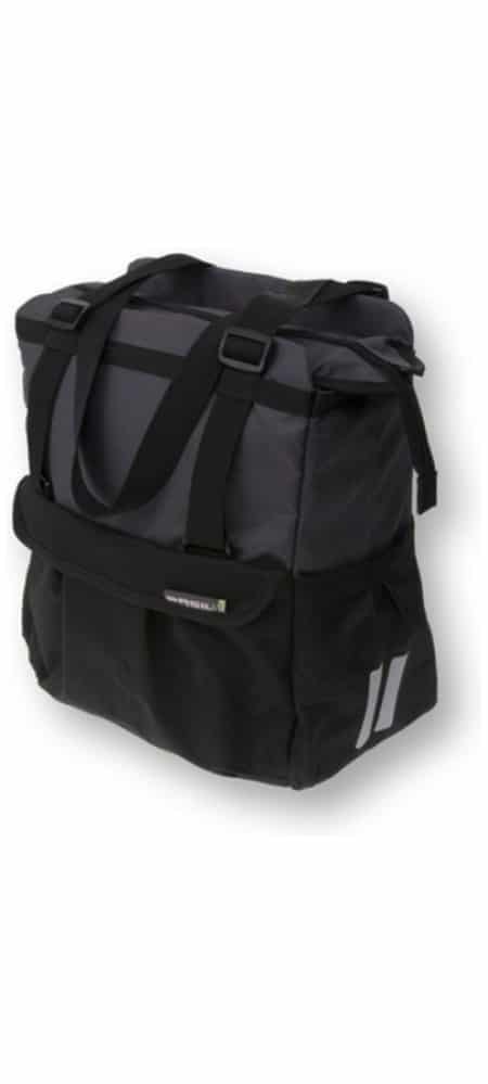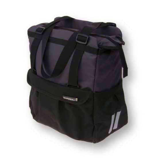 Deze ruime shopper van Basil heeft een groot voorvak dat is af te sluiten met een rits. Hij heeft zijvakken, een hoofdvak en is voorzien van speciale banden om een flessen in te bewaren. Je neemt de tas makkelijk mee op de fiets door middel van de bevestigingshaken voor je bagagedrager. Hij heeft verstelbare draagriemen die te verlengen zijn naar schouderbanden.