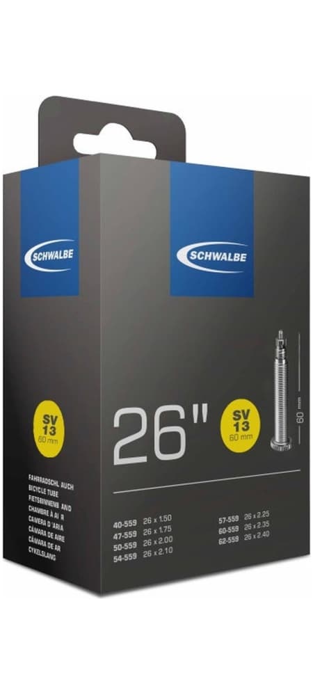 Schwalbe binnenband Breed MTB 26 Inch Frans 60mm – SV13/40-559, 47-559, 50-559, 54-559, 57-559, 60-559, 62-559*. De Schwalbe binnenbanden zijn betrouwbaar. Fietsdetaillisten waarderen hem om zijn hoge betrouwbaarheid. Iedere band wordt in de fabriek opgepompt en zo 24 uur op luchtdichtheid getest. De band houdt de luchtdruk langer vast. In de productie vereist Schwalbe een zeer hoog butyl aandeel en een zeer hoge reinheid van het materiaal. Zo houdt de Schwalbe binnenband de luchtdruk beduidend langer vast dan andere binnenbanden. Het is een groepen-binnenbandsysteem: Een Schwalbe binnenband is extreem elastisch en past op meerdere bandafmetingen. Hierdoor worden ze groepen binnenbanden genoemd. Zo past bijvoorbeeld de binnenband met nummer 19A voor bandafmeting van 27.5 inch tot 29 Inch en voor de breedte van 40 tot 62mm. Als laatste is de band 100% volledig recyclebaar. Standaarduitvoering: Hoge betrouwbaarheid, al vele jaren beproefd. *Niet in de Extralight-uitvoering verkrijgbaar.