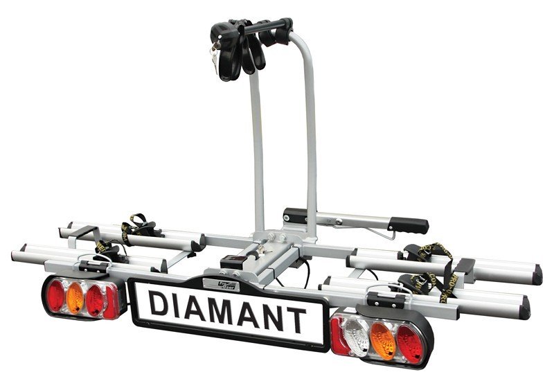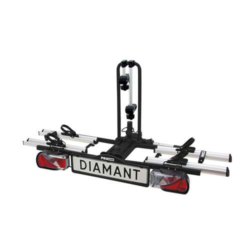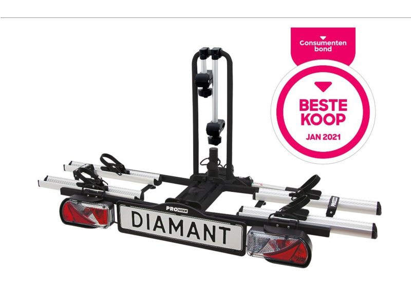 De Pro-User Diamant is geschikt voor het vervoer van 2 (elektrische) fietsen! Dit komt mede door het handige inklapsysteem, de kantelfunctie en de eenvoudige montage op de trekhaak door een gepatenteerde, afsluitbare snelkoppeling. De verlichting werkt via een gecombineerde 7 of13-polige (Jaeger) stekker, inclusief mistachterlicht en achteruitrijverlichting (via 13-polige stekker). De fietsen staan in brede, stabiele aluminium wielgoten en worden bevestigd aan het frame zodat er geen belasting op het crankstel van de fiets komt te staan.